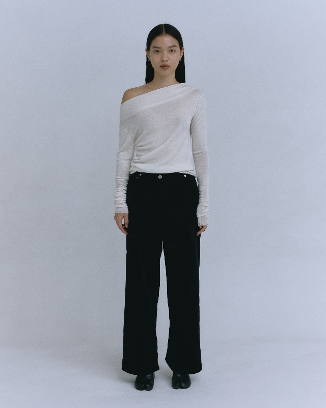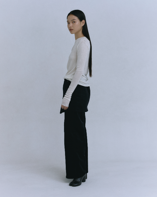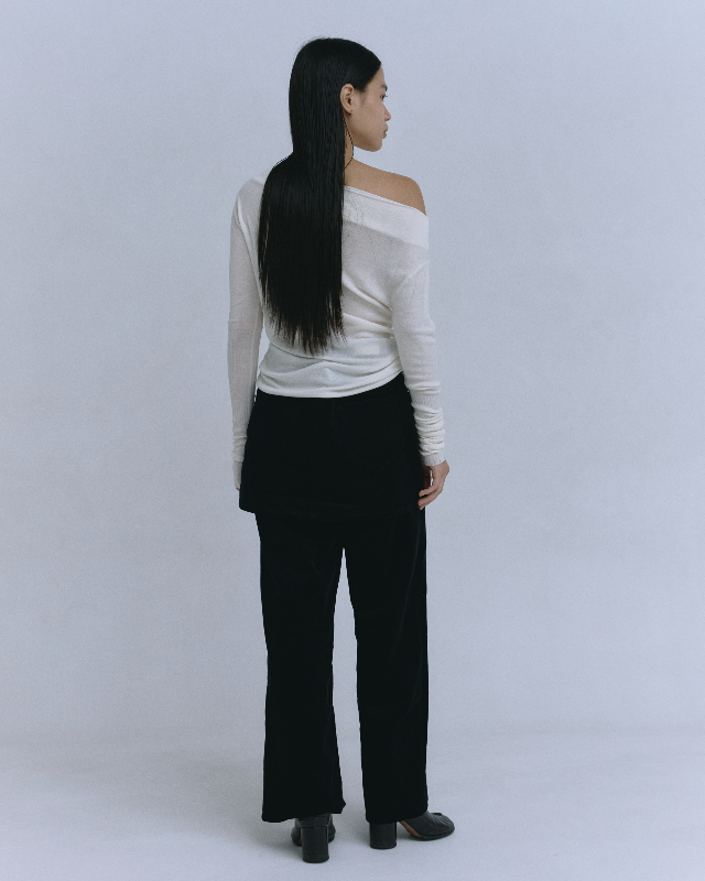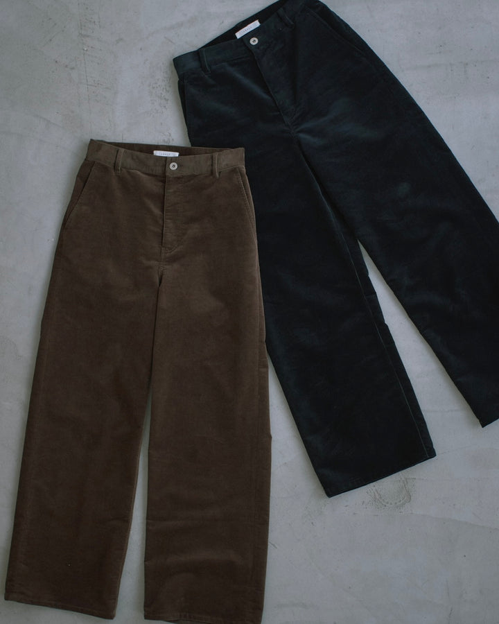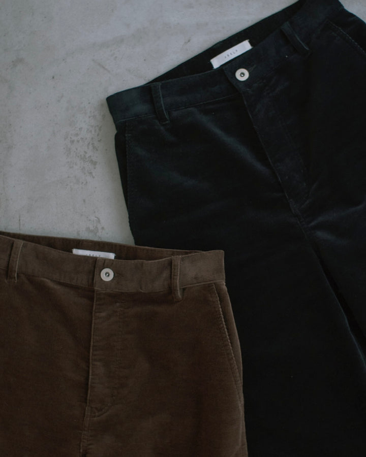 高品質なオーガニックコットンを使用した、まるでニットのような膨らみのあるストレッチコーデュロイ素材のパンツと巻きスカートのセット。