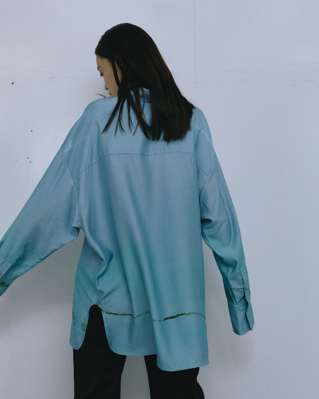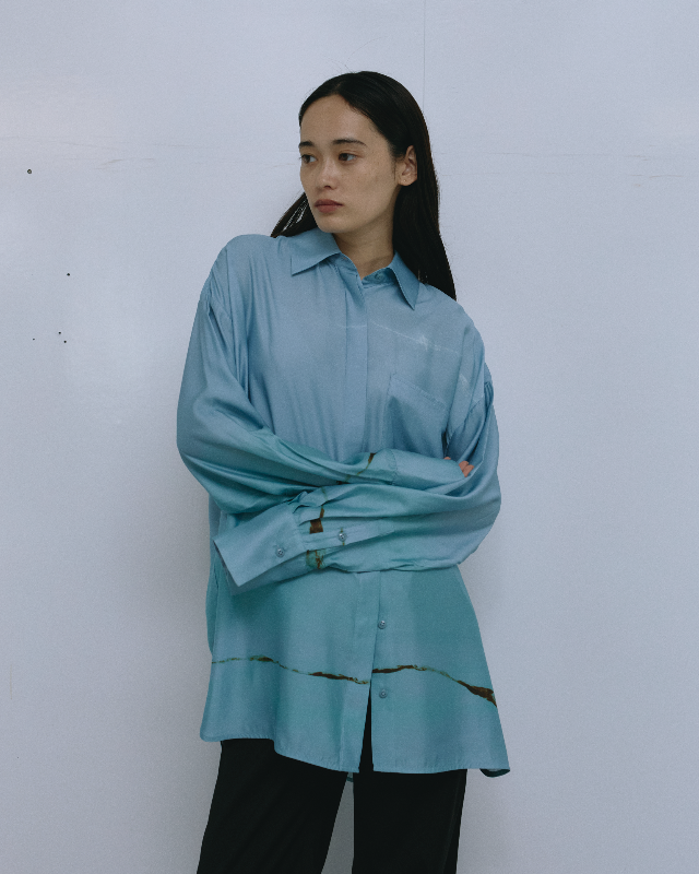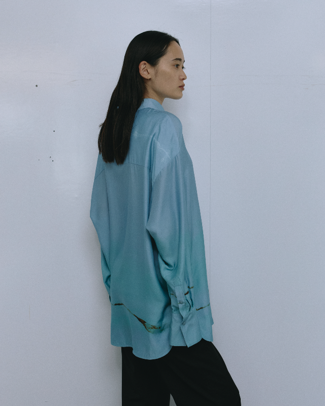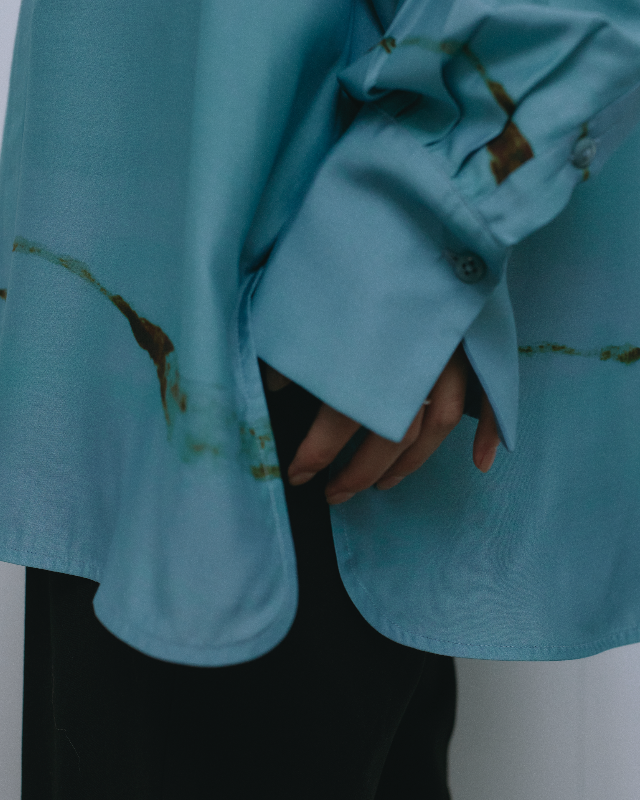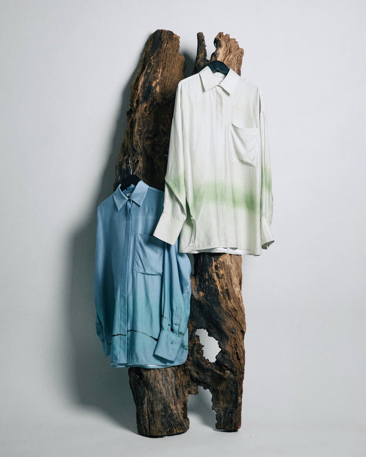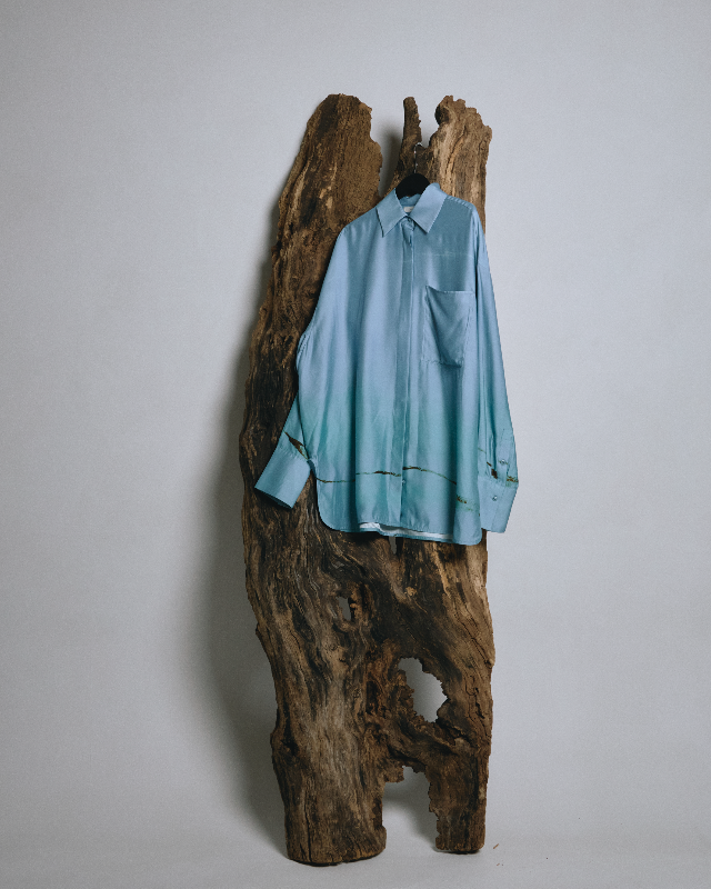 かけがえのない記憶のかけらたちを、春・夏・秋・冬の4つのアートで表現。夏(ECRU) / 冬(DUSTY BLUE)の2つのアートをシルクシャツに落とし込みました。