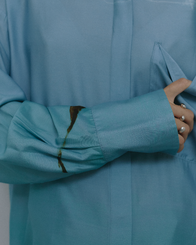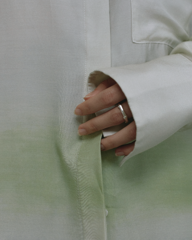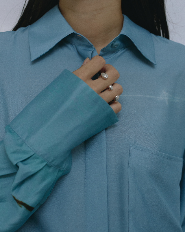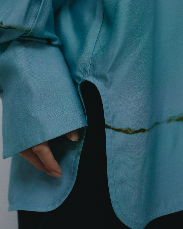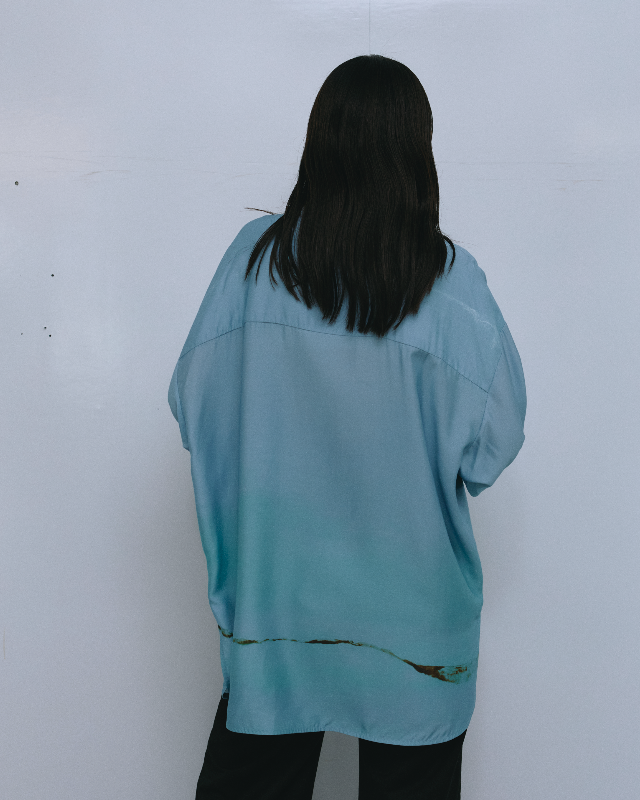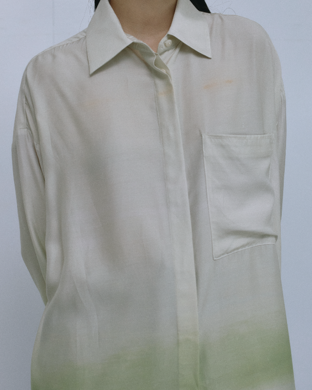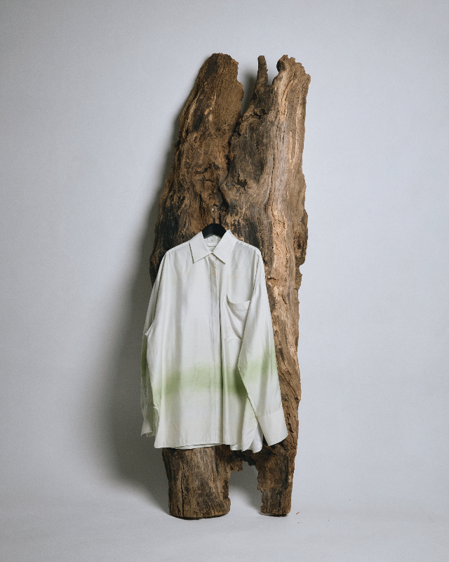 かけがえのない記憶のかけらたちを、春・夏・秋・冬の4つのアートで表現。夏(ECRU) / 冬(DUSTY BLUE)の2つのアートをシルクシャツに落とし込みました。